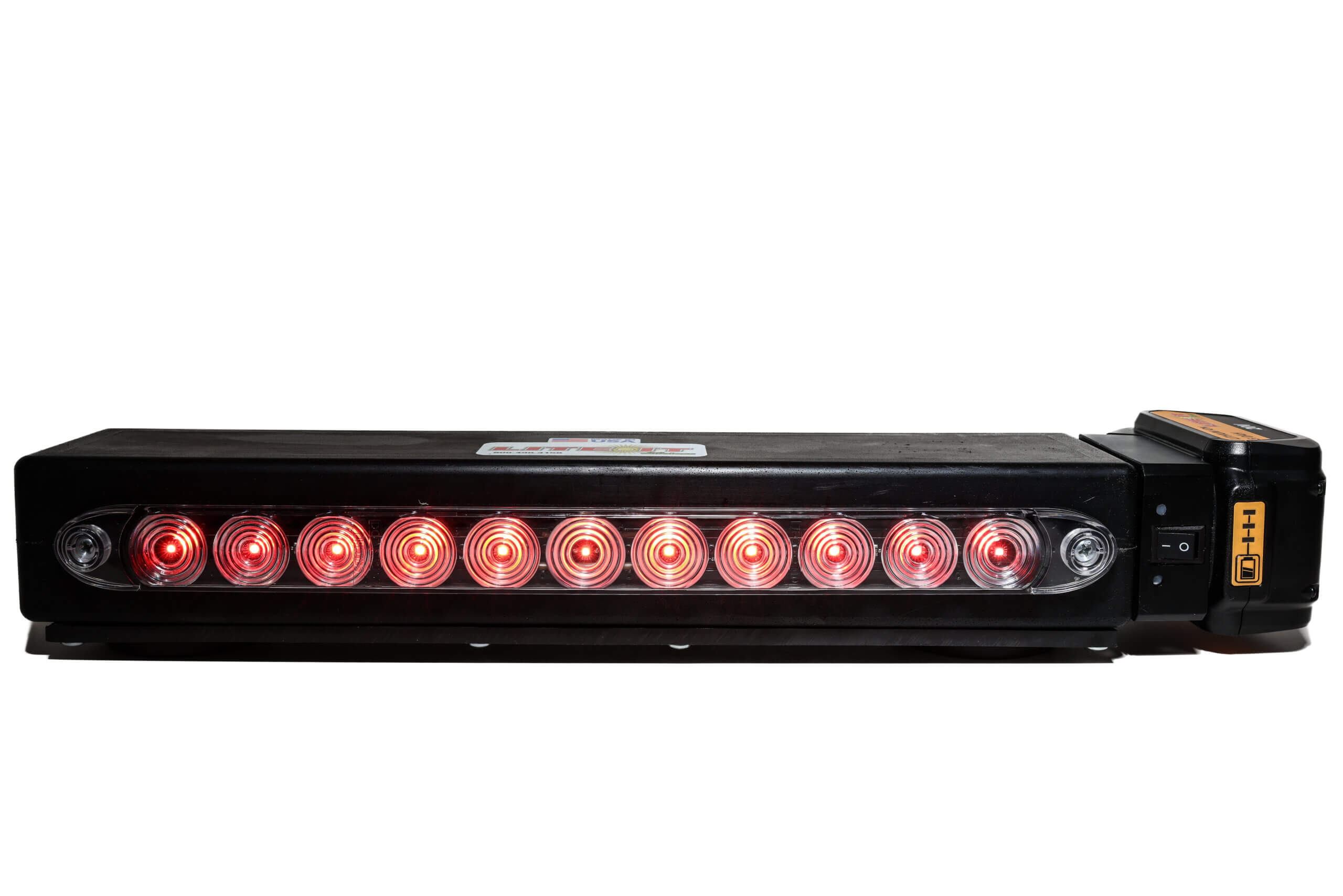 Our Mini light bar is sleek and black and has 2 strong rubber coated magnets on the bottom and our same awesome wireless technology inside as our other light bars. Our circuitry bucks the voltage down from your Milwaukee or Dewalt Battery to 12v automatically.ย You will never run out of battery power as long as you have a battery to change out, No more charging light bars, just plug in a fresh battery and go! This mini light bar has a single green LED in the rear of the light bar that indicates to the driver that the light bar is on and powered up.ย If you see the green light in your rear view mirror, you light is powered up and running.ย You can buy this light bar with a standard 4 pin round transmitter, 7B (RV style) transmitter, or even a 7R (big rig) transmitter.